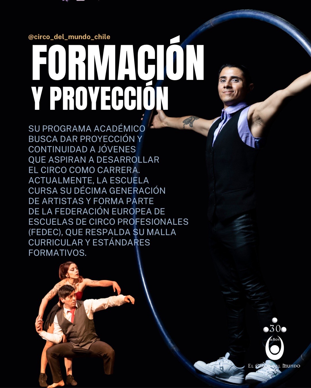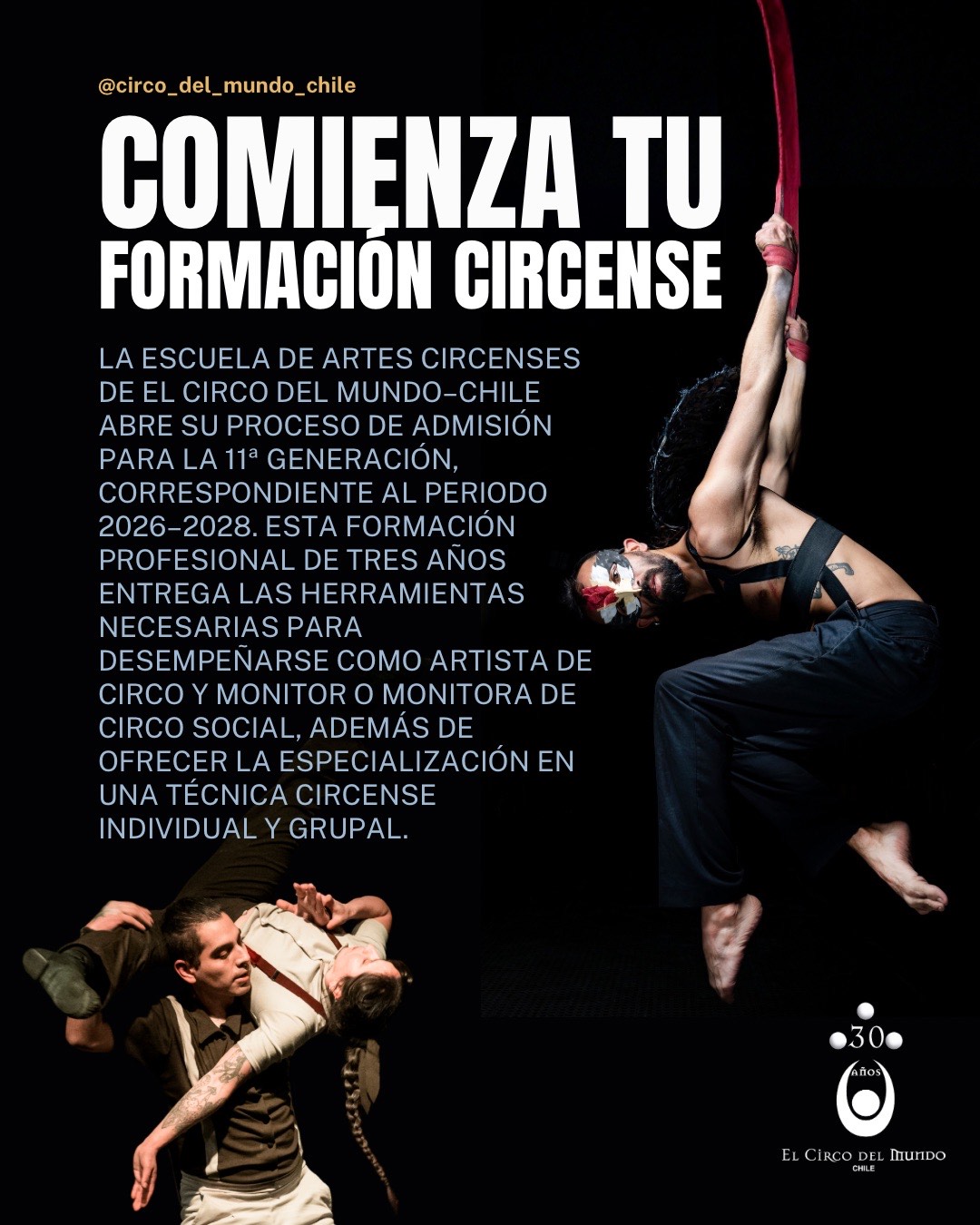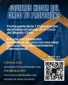 El Circo del Mundo–Chile abre oficialmente el proceso de admisión a su Escuela de Artes Circenses para la generación 2026–2028. Esta instancia formativa, única en el país, ofrece una formación profesional e integral en las artes circenses, combinando excelencia técnica, académica y artística. Su malla curricular cuenta con el respaldo de la Federación Mundial de Escuelas de Circo (FEDEC), de la cual la escuela forma parte.