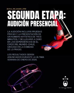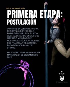 La audición presencial se realizará a mediados de enero de 2026 en las dependencias de El Circo del Mundo–Chile (Av. General Óscar Bonilla 6.100B, Lo Prado, Santiago). En esta instancia, además de presentar en vivo la técnica específica, cada postulante deberá realizar una demostración física general. Puedes revisar un ejemplo en nuestro canal de YouTube: