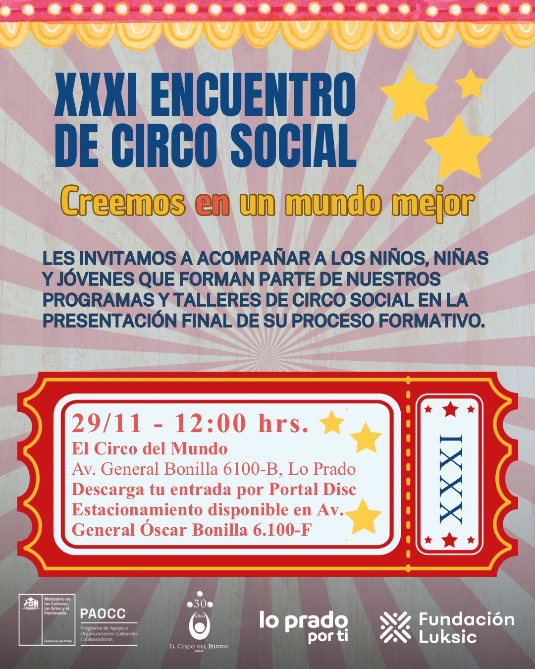 El Circo del Mundo-Chile invita a la comunidad a una nueva versión del XXXI Encuentro de Circo Social: Creemos en un mundo mejor, una jornada donde niñas, niños y jóvenes presentarán el cierre de su proceso formativo en nuestras escuelas y programas de circo social. Este evento se realizará el sábado 29 de noviembre, a las 12:00 hrs, en nuestra Carpa La Afortunada.